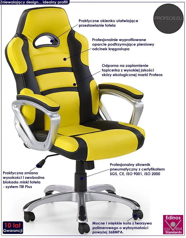 Designerska tapicerka fotela pokryta została wysokiej jakości skórą ekologiczną marki Profeos. Ekoskóra używana przy produkcji mebli Profeos jest o wiele bardziej odporna na słońce oraz wodę , co pozwala Ci na długie i bezpieczne użytkowanie. Już nie musisz się martwić, że rozlana kawa spowoduje konieczność wymiany mebla. Skóra ekologiczna marki Profeos została pokryta warstwą polichlorku winylu. Fotel ten bez wątpienia zadowoli wszystkich wielbicieli wygody i nowoczesnego designu. Nie musisz ryzykować nabycia wad postawy spowodowanych użytkowaniem tanich, chińskich krzeseł. Zainwestuj w zdrowie Twoje i Twoich najbliższych kupując wysokiej jakości fotel marki Profeos.