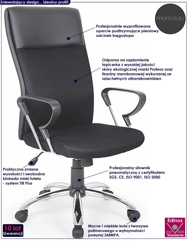 Ergonomicznie profilowane siedzisko oraz oparcie oraz podłokietniki zapewniają Ci komfort pracy nawet przez długie godziny. Dowolnie regulowana wysokość siedziska gwarantuje, że dopasujesz je dokładnie do Twojego wzrostu i podczas pracy będziesz się czuł komfortowo. Precyzyjny system Tilt Plus umożliwia dokładną blokadę oparcia siedziska w pozycji pionowej lub swobodne bujanie się (idealne rozwiązanie na przerwę w pracy oraz relaks). To niezwykle wygodna i bardzo zdrowa metoda, gdyż przechylenie się do tyłu zapewnia Ci optymalne krążenie krwi i zwalnia napięcie w udach! Fotel ten bez wątpienia zadowoli wszystkich wielbicieli wygody i nieszablonowego designu. Nie musisz ryzykować nabycia wad postawy spowodowanych użytkowaniem tanich, chińskich krzeseł. Zainwestuj w zdrowie Twoje i Twoich najbliższych kupując wysokiej jakości fotel marki Profeos.