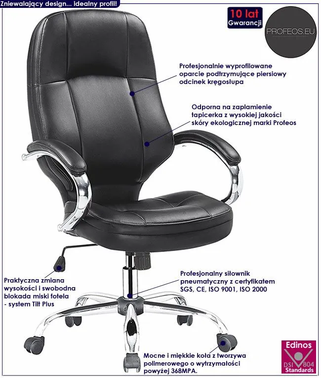 Designerska tapicerka fotela pokryta została wysokiej jakości skórą ekologiczną marki Profeos. Ekoskóra używana przy produkcji mebli Profeos jest o wiele bardziej odporna na słońce oraz wodę , co pozwala Ci na długie i bezpieczne użytkowanie. Już nie musisz się martwić, że rozlana kawa spowoduje konieczność wymiany mebla. Skóra ekologiczna marki Profeos została pokryta warstwą polichlorku winylu. Komfortowo wyprofilowane przy wsparciu europejskich specjalistów z dziedziny ortopedii siedzisko, oparcie oraz podłokietniki zapewniają Ci wygodę nawet podczas dłuższego czasu spędzonego za biurkiem. Fotel ten bez wątpienia zadowoli wszystkich wielbicieli wygody i wysmakowanego designu. Nie musisz ryzykować nabycia wad postawy spowodowanych użytkowaniem tanich, chińskich krzeseł. Zainwestuj w zdrowie Twoje i Twoich najbliższych kupując wysokiej jakości fotel marki Profeos.