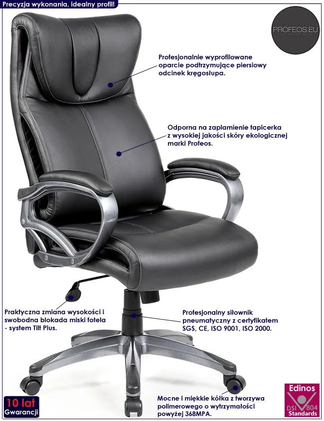 Czy wiesz, że według specjalistów europejskiej ortopedii właściwie dopasowane krzesło oraz biurko chronią Cię przed schorzeniami kręgosłupa takimi jak skolioza idiopatyczna, a w następstwie przed koniecznością poddawania się leczeniu wad postawy? Fotel do gabinetu Bals posiada perfekcyjnie wyprofilowane oparcie, które podtrzymuje odcinek piersiowy kręgosłupa i w efekcie pozwala na pracę przy biurku bez bólu i niewygody. Designerska tapicerka fotela pokryta została wysokiej jakości skórą ekologiczną marki Profeos. Ekoskóra używana przy produkcji mebli Profeos jest o wiele bardziej odporna na słońce oraz substancje płynne , co pozwala Ci na długie i bezpieczne użytkowanie. Już nie musisz się martwić, że rozlana kawa spowoduje konieczność wymiany mebla. Skóra ekologiczna marki Profeos została pokryta warstwą polichlorku winylu. Krzesło obrotowe Bals bez wątpienia zadowoli wszystkich wielbicieli wygody i innowacyjnego designu. Nie musisz ryzykować nabycia wad postawy spowodowanych użytkowaniem tanich, chińskich krzeseł. Zainwestuj w zdrowie Twoje i Twoich najbliższych kupując wysokiej jakości fotel marki Profeos.