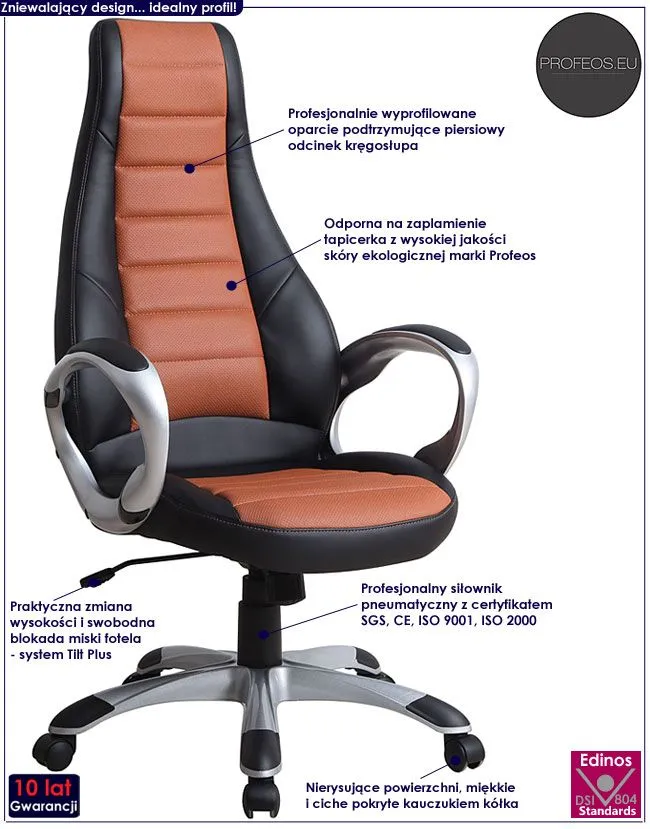 Designerska tapicerka fotela pokryta została wysokiej jakości skórą ekologiczną marki Profeos oraz ekoskórą perforowaną. Ekoskóra używana przy produkcji mebli Profeos jest o wiele bardziej odporna na słońce oraz wodę , co pozwala Ci na długie i bezpieczne użytkowanie. Już nie musisz się martwić, że rozlana kawa spowoduje konieczność wymiany mebla. Skóra ekologiczna marki Profeos została pokryta warstwą polichlorku winylu. Ekonomicznie wyprofilowane przy wsparciu europejskich specjalistów z dziedziny ortopedii siedzisko, oparcie oraz podłokietniki zapewniają Ci wygodę nawet podczas dłuższego czasu spędzonego za biurkiem. Fotel ten bez wątpienia zadowoli wszystkich wielbicieli nowoczesnej formy i oryginalnej stylistyki. Nie musisz ryzykować nabycia wad postawy spowodowanych użytkowaniem tanich, chińskich krzeseł. Zainwestuj w zdrowie Twoje i Twoich najbliższych kupując wysokiej jakości fotel marki Profeos.