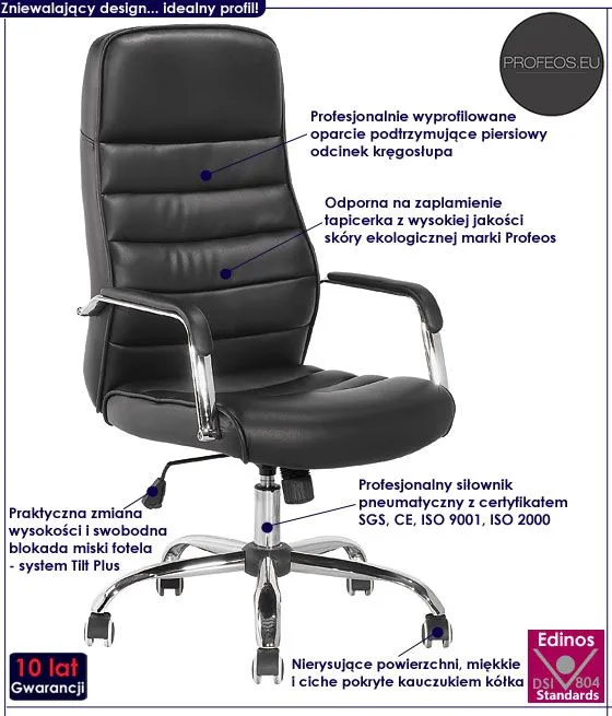 Designerska tapicerka fotela pokryta została wysokiej jakości skórą ekologiczną marki Profeos. Ekoskóra używana przy produkcji mebli Profeos jest o wiele bardziej odporna na słońce oraz wodę , co pozwala Ci na długie i bezpieczne użytkowanie. Już nie musisz się martwić, że rozlana kawa spowoduje konieczność wymiany mebla. Skóra ekologiczna marki Profeos została pokryta warstwą polichlorku winylu. Ekonomicznie wyprofilowane przy wsparciu europejskich specjalistów z dziedziny ortopedii siedzisko, oparcie oraz podłokietniki zapewniają Ci wygodę nawet podczas dłuższego czasu spędzonego za biurkiem. Fotel ten bez wątpienia zadowoli wszystkich wielbicieli nowoczesnej formy i oryginalnej stylistyki. Nie musisz ryzykować nabycia wad postawy spowodowanych użytkowaniem tanich, chińskich krzeseł. Zainwestuj w zdrowie Twoje i Twoich najbliższych kupując wysokiej jakości fotel marki Profeos.