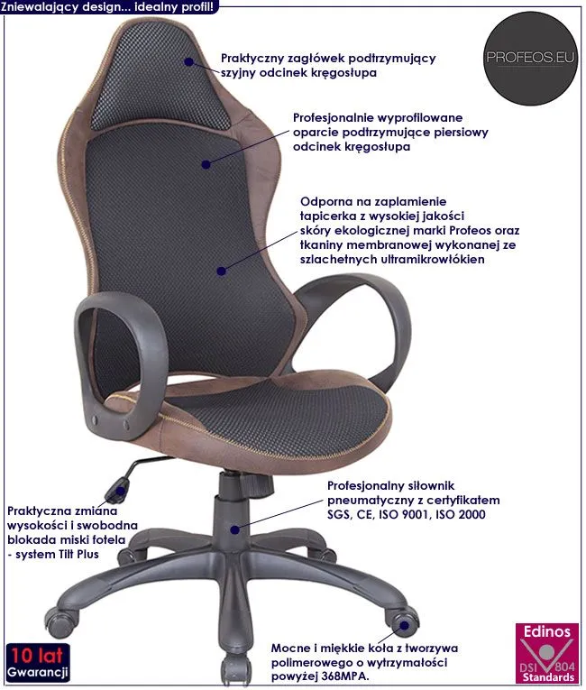 Designerska tapicerka fotela pokryta została wysokiej jakości perforowaną skórą ekologiczną marki Profeos oraz tkaniną mebranową wykonaną ze szlachetnych ultramikrowłókien. Materiał ten cechuje się ponadprzeciętną odpornością na zabrudzenia. Mikrosiatka pozwala także na oddychanie skóry oraz zapobiega nadmiernemu przegrzewaniu się ciała. Ekoskóra używana przy produkcji mebli Profeos jest o wiele bardziej odporna na słońce oraz wodę , co pozwala Ci na długie i bezpieczne użytkowanie. Już nie musisz się martwić, że rozlana kawa spowoduje konieczność wymiany mebla. Skóra ekologiczna marki Profeos została pokryta warstwą polichlorku winylu. Fotel ten bez wątpienia zadowoli wszystkich wielbicieli wygody i innowacyjnego designu. Nie musisz ryzykować nabycia wad postawy spowodowanych użytkowaniem tanich, chińskich krzeseł. Zainwestuj w zdrowie Twoje i Twoich najbliższych kupując wysokiej jakości fotel marki Profeos.