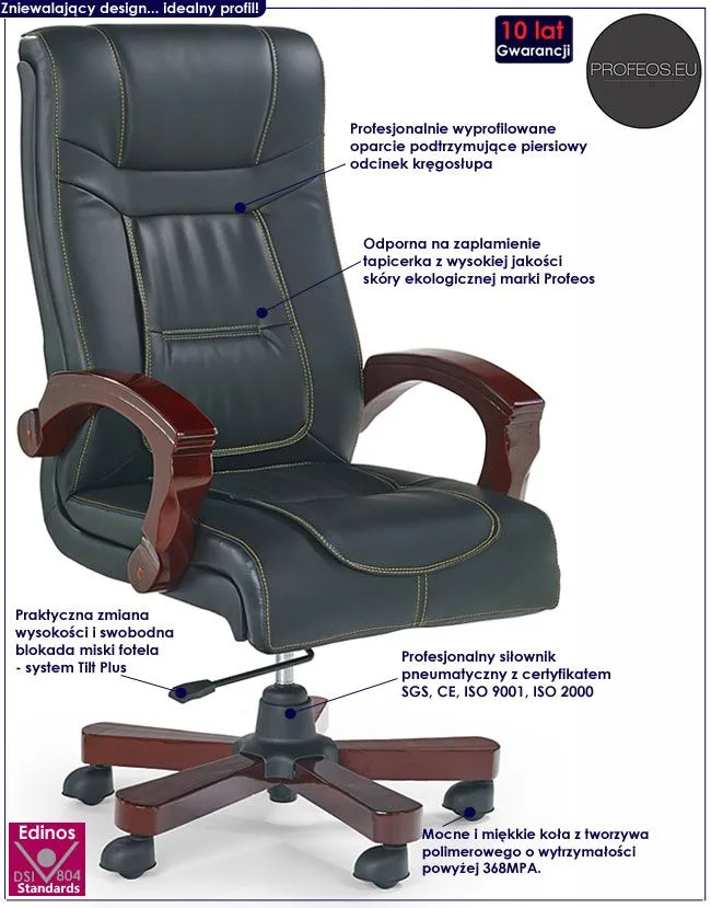 Designerska tapicerka fotela pokryta została wysokiej jakości skórą ekologiczną marki Profeos. Ekoskóra używana przy produkcji mebli Profeos jest o wiele bardziej odporna na słońce oraz wodę , co pozwala Ci na długie i bezpieczne użytkowanie. Już nie musisz się martwić, że rozlana kawa spowoduje konieczność wymiany mebla. Skóra ekologiczna marki Profeos została pokryta warstwą polichlorku winylu. Komfortowo wyprofilowane przy wsparciu europejskich specjalistów z dziedziny ortopedii siedzisko, oparcie oraz podłokietniki zapewniają Ci wygodę nawet podczas dłuższego czasu spędzonego za biurkiem. Fotel ten bez wątpienia zadowoli wszystkich wielbicieli nowoczesnej formy i oryginalnej stylistyki. Nie musisz ryzykować nabycia wad postawy spowodowanych użytkowaniem tanich, chińskich krzeseł. Zainwestuj w zdrowie Twoje i Twoich najbliższych kupując wysokiej jakości fotel marki Profeos.