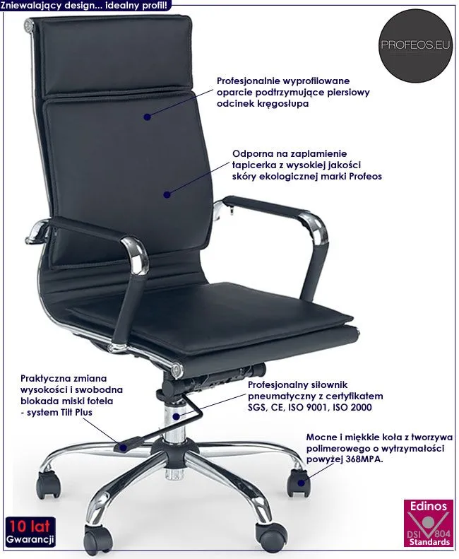 Designerska tapicerka fotela pokryta została wysokiej jakości skórą ekologiczną marki Profeos. Ekoskóra używana przy produkcji mebli Profeos jest o wiele bardziej odporna na słońce oraz wodę , co pozwala Ci na długie i bezpieczne użytkowanie. Już nie musisz się martwić, że rozlana kawa spowoduje konieczność wymiany mebla. Skóra ekologiczna marki Profeos została pokryta warstwą polichlorku winylu. Komfortowo wyprofilowane przy wsparciu europejskich specjalistów z dziedziny ortopedii siedzisko, oparcie oraz podłokietniki zapewniają Ci wygodę nawet podczas dłuższego czasu spędzonego za biurkiem. Fotel ten bez wątpienia zadowoli wszystkich wielbicieli nowoczesnej formy i oryginalnej stylistyki. Nie musisz ryzykować nabycia wad postawy spowodowanych użytkowaniem tanich, chińskich krzeseł. Zainwestuj w zdrowie Twoje i Twoich najbliższych kupując wysokiej jakości fotel marki Profeos.