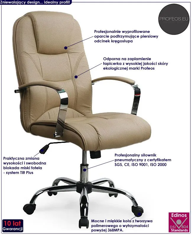 Designerska tapicerka fotela pokryta została wysokiej jakości perforowaną skórą ekologiczną marki Profeos. Ekoskóra używana przy produkcji mebli Profeos jest o wiele bardziej odporna na słońce oraz wodę , co pozwala Ci na długie i bezpieczne użytkowanie. Już nie musisz się martwić, że rozlana kawa spowoduje konieczność wymiany mebla. Skóra ekologiczna marki Profeos została pokryta warstwą polichlorku winylu. Ergonomicznie wyprofilowane przy wsparciu europejskich specjalistów z dziedziny ortopedii siedzisko, oparcie oraz podłokietniki zapewniają Ci wygodę nawet podczas dłuższego czasu spędzonego za biurkiem. Dowolnie regulowana wysokość siedziska gwarantuje, że dopasujesz je dokładnie do Twojego wzrostu i podczas pracy będziesz się czuł komfortowo. Fotel ten bez wątpienia zadowoli wszystkich wielbicieli wygody i wysmakowanego designu. Nie musisz ryzykować nabycia wad postawy spowodowanych użytkowaniem tanich, chińskich krzeseł. Zainwestuj w zdrowie Twoje i Twoich najbliższych kupując wysokiej jakości fotel marki Profeos.