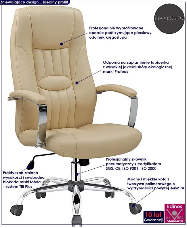 Designerska tapicerka fotela pokryta została wysokiej jakości skórą ekologiczną marki Profeos. Ekoskóra używana przy produkcji mebli Profeos jest o wiele bardziej odporna na słońce oraz wodę , co pozwala Ci na długie i bezpieczne użytkowanie. Już nie musisz się martwić, że rozlana kawa spowoduje konieczność wymiany mebla. Skóra ekologiczna marki Profeos została pokryta warstwą polichlorku winylu. Komfortowo wyprofilowane przy wsparciu europejskich specjalistów z dziedziny ortopedii siedzisko, podłokietniki oraz oparcie zapewniają Ci wygodę nawet podczas dłuższego czasu spędzonego za biurkiem. Fotel Ilia bez wątpienia zadowoli wszystkich wielbicieli wygody i wysmakowanego designu. Nie musisz ryzykować nabycia wad postawy spowodowanych użytkowaniem tanich, chińskich krzeseł. Zainwestuj w zdrowie Twoje i Twoich najbliższych kupując wysokiej jakości fotel marki Profeos.