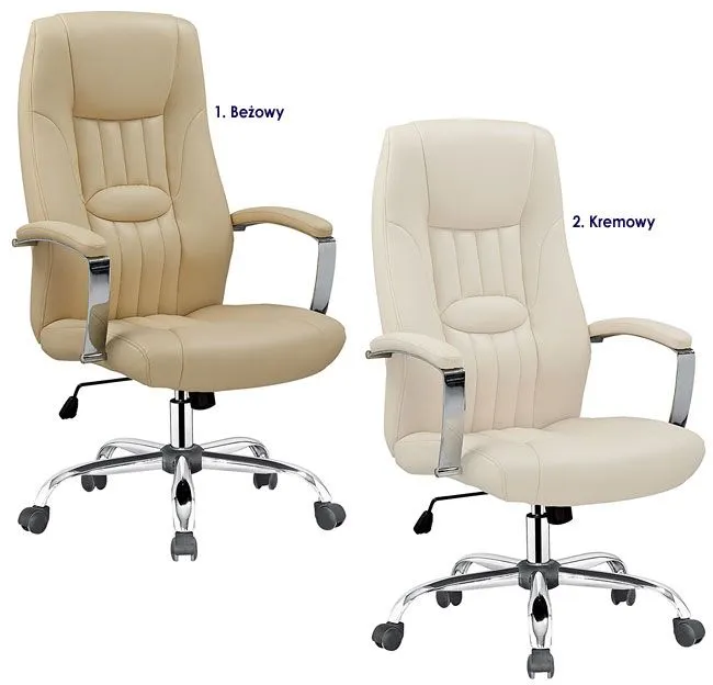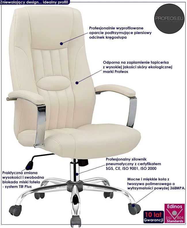 Designerska tapicerka fotela pokryta została wysokiej jakości skórą ekologiczną marki Profeos. Ekoskóra używana przy produkcji mebli Profeos jest o wiele bardziej odporna na słońce oraz wodę , co pozwala Ci na długie i bezpieczne użytkowanie. Już nie musisz się martwić, że rozlana kawa spowoduje konieczność wymiany mebla. Skóra ekologiczna marki Profeos została pokryta warstwą polichlorku winylu. Komfortowo wyprofilowane przy wsparciu europejskich specjalistów z dziedziny ortopedii siedzisko, podłokietniki oraz oparcie zapewniają Ci wygodę nawet podczas dłuższego czasu spędzonego za biurkiem. Krzesło dostępne jest w 2 modnych kolorach: kremowym oraz beżowym, dzięki czemu z pewnością wybierzesz to, które lepiej wkomponuje się w Twoje wnętrze. Fotel Ilia bez wątpienia zadowoli wszystkich wielbicieli wygody i wysmakowanego designu. Nie musisz ryzykować nabycia wad postawy spowodowanych użytkowaniem tanich, chińskich krzeseł. Zainwestuj w zdrowie Twoje i Twoich najbliższych kupując wysokiej jakości fotel marki Profeos.