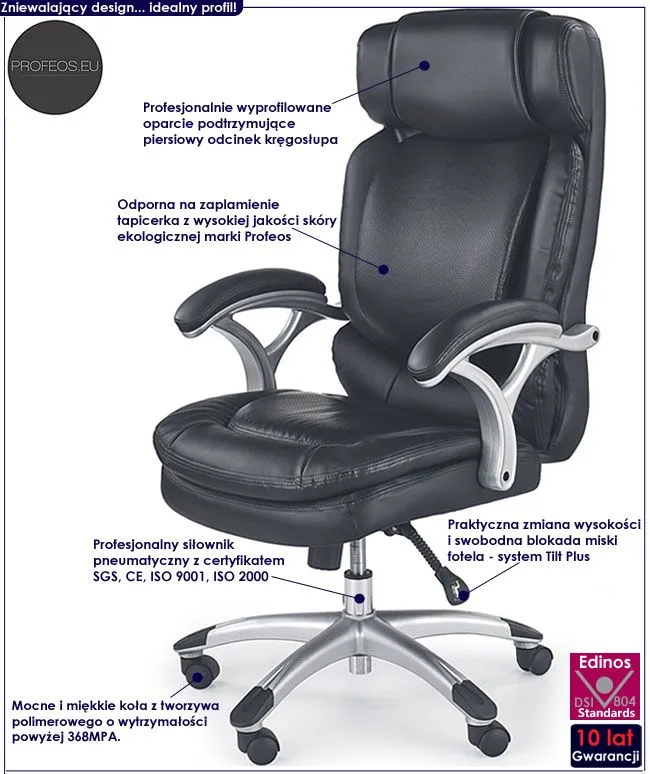 Designerska tapicerka fotela pokryta została wysokiej jakości skórą ekologiczną marki Profeos. Ekoskóra używana przy produkcji mebli Profeos jest o wiele bardziej odporna na słońce oraz wodę , co pozwala Ci na długie i bezpieczne użytkowanie. Już nie musisz się martwić, że rozlana kawa spowoduje konieczność wymiany mebla. Skóra ekologiczna marki Profeos została pokryta warstwą polichlorku winylu. Komfortowo wyprofilowane przy wsparciu europejskich specjalistów z dziedziny ortopedii siedzisko, oparcie oraz podłokietniki zapewniają Ci wygodę nawet podczas dłuższego czasu spędzonego za biurkiem. Fotel ten bez wątpienia zadowoli wszystkich wielbicieli prostej formy i oryginalnej stylistyki. Nie musisz ryzykować nabycia wad postawy spowodowanych użytkowaniem tanich, chińskich krzeseł. Zainwestuj w zdrowie Twoje i Twoich najbliższych kupując wysokiej jakości fotel marki Profeos.