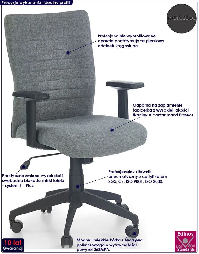Czy wiesz, że według specjalistów europejskiej ortopedii właściwie dopasowane krzesło oraz biurko chronią Cię przed schorzeniami kręgosłupa takimi jak skolioza idiopatyczna, a w następstwie przed koniecznością poddawania się leczeniu wad postawy? Fotel biurowy Malla posiada perfekcyjnie wyprofilowane oparcie, które podtrzymuje odcinek piersiowy kręgosłupa i w efekcie pozwala na pracę przy biurku bez bólu i niewygody. Tapicerka fotela pokryta została wysokiej jakości tkaniną Alcantar Pro, charakteryzującą się dużą odpornością na ścieranie i zabrudzenie oraz niezwykłą miękkością w dotyku (dzięki warstwie poliuretanu). Tkanina Alcantar marki Profeos, która jako jedyna na rynku produkowana jest z dokładnie wyselekcjonowanych ultramikrowłókien o objętości aż do 24-razy drobniejszej od ludzkiego włosa, wyróżnia się wyjątkową żywotnością, odpornością oraz niezwykłą łatwością w utrzymaniu. Posiada ponadprzeciętne cechy wytrzymałościowe. Tkanina Alcantar jest także bardzo praktyczna i można ją czyścić na mokro, dzięki czemu unikniesz kłopotliwej wymiany tapicerki w przypadku zalania jej kawą. Dwa modne, stonowane kolory mebla doskonale sprawdzają się zarówno w nowocześnie jak i tradycyjnie urządzonych pracowniach, biurach czy innych pomieszczeniach. Nie musisz ryzykować nabycia wad postawy spowodowanych użytkowaniem tanich, chińskich mebli. Zainwestuj w zdrowie Twoje i Twoich najbliższych kupując wysokiej jakości mebel marki Profeos.