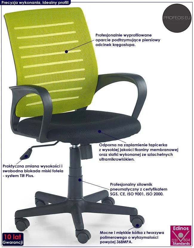 Czy wiesz, że według specjalistów europejskiej ortopedii właściwie dopasowane krzesło oraz biurko chronią Cię przed schorzeniami kręgosłupa takimi jak skolioza idiopatyczna, a w następstwie przed koniecznością poddawania się leczeniu wad postawy? Fotel biurowy Ognis posiada perfekcyjnie wyprofilowane oparcie, które podtrzymuje odcinek piersiowy kręgosłupa i w efekcie pozwala na pracę przy biurku bez bólu i niewygody. Tapicerka mebla pokryta została wysokiej jakości tkaniną membranową wykonaną ze szlachetnych ultramikrowłókien. Materiał ten cechuje się ponadprzeciętną odpornością na zabrudzenia i wilgoć, dzięki czemu unikniesz co sezonowej wymiany mebla. Mikrosiatka pozwala także na oddychanie skóry oraz zapobiega nadmiernemu przegrzewaniu się ciała, co jest szczególnie istotne dla osób spędzających na fotelu dłuższy czas. Dwa modne kolory mebla doskonale sprawdzają się zarówno w nowocześnie jak i tradycyjnie urządzonych pracowniach, biurach czy innych pomieszczeniach. Nie musisz ryzykować nabycia wad postawy spowodowanych użytkowaniem tanich, chińskich mebli. Zainwestuj w zdrowie Twoje i Twoich najbliższych kupując wysokiej jakości mebel marki Profeos.