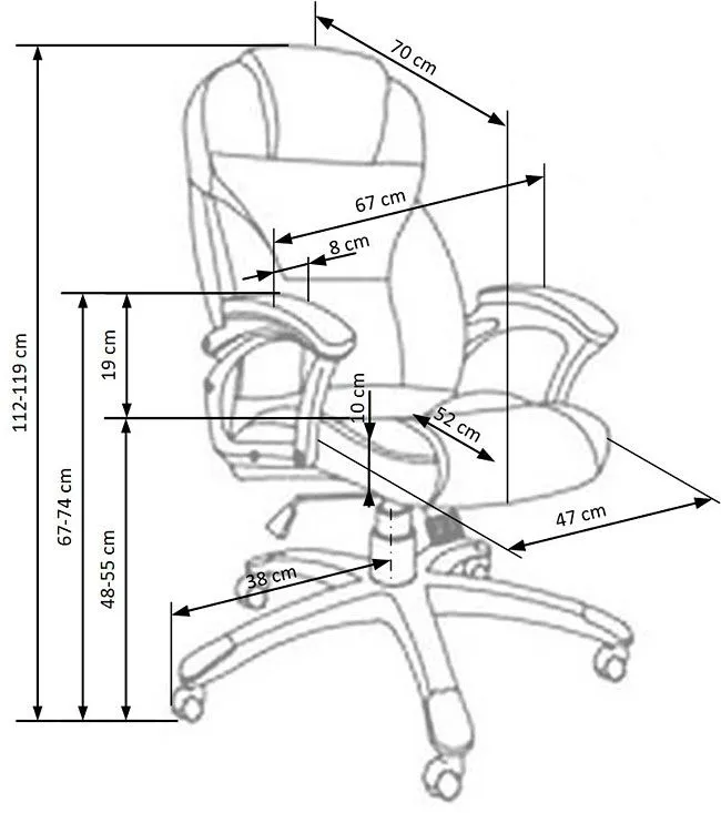 - Wymiary: szerokość mebla: 67 cm, szerokość siedziska: 47 cm, głębokość mebla: 70 cm, głębokość siedziska: 52 cm, wysokość całkowita: 112-119 cm, wysokość od podłoża do końca podłokietników: 67-74 cm, wysokość siedziska: 48-55 cm.