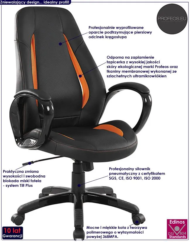 Designerska tapicerka fotela pokryta została wysokiej jakości skórą ekologiczną marki Profeos, ekoskórą perforowaną oraz tkaniną membranową wykonaną ze szlachetnych ultramikrowłókien. Ekoskóra używana przy produkcji mebli Profeos jest o wiele bardziej odporna na słońce oraz wodę , co pozwala Ci na długie i bezpieczne użytkowanie. Już nie musisz się martwić, że rozlana kawa spowoduje konieczność wymiany mebla. Skóra ekologiczna marki Profeos została pokryta warstwą polichlorku winylu. Mikrosiatka Profeos pozwala na oddychanie skóry oraz zapobiega nadmiernemu przegrzewaniu się ciała. Komfortowo wyprofilowane przy wsparciu europejskich specjalistów z dziedziny ortopedii siedzisko, oparcie oraz podłokietniki zapewniają Ci wygodę nawet podczas dłuższego czasu spędzonego za biurkiem. Fotel ten bez wątpienia zadowoli wszystkich wielbicieli prostej formy i uniwersalnej stylistyki. Nie musisz ryzykować nabycia wad postawy spowodowanych użytkowaniem tanich, chińskich krzeseł. Zainwestuj w zdrowie Twoje i Twoich najbliższych kupując wysokiej jakości fotel marki Profeos.