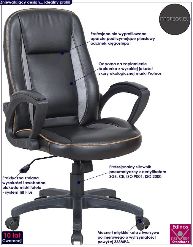 Designerska tapicerka fotela pokryta została wysokiej jakości skórą ekologiczną marki Profeos. Ekoskóra używana przy produkcji mebli Profeos jest o wiele bardziej odporna na słońce oraz wodę , co pozwala Ci na długie i bezpieczne użytkowanie. Już nie musisz się martwić, że rozlana kawa spowoduje konieczność wymiany mebla. Skóra ekologiczna marki Profeos została pokryta warstwą polichlorku winylu. Ekonomicznie wyprofilowane przy wsparciu europejskich specjalistów z dziedziny ortopedii siedzisko, oparcie oraz podłokietniki zapewniają Ci wygodę nawet podczas dłuższego czasu spędzonego za biurkiem. Fotel ten bez wątpienia zadowoli wszystkich wielbicieli nowoczesnej formy i oryginalnej stylistyki. Nie musisz ryzykować nabycia wad postawy spowodowanych użytkowaniem tanich, chińskich krzeseł. Zainwestuj w zdrowie Twoje i Twoich najbliższych kupując wysokiej jakości fotel marki Profeos.