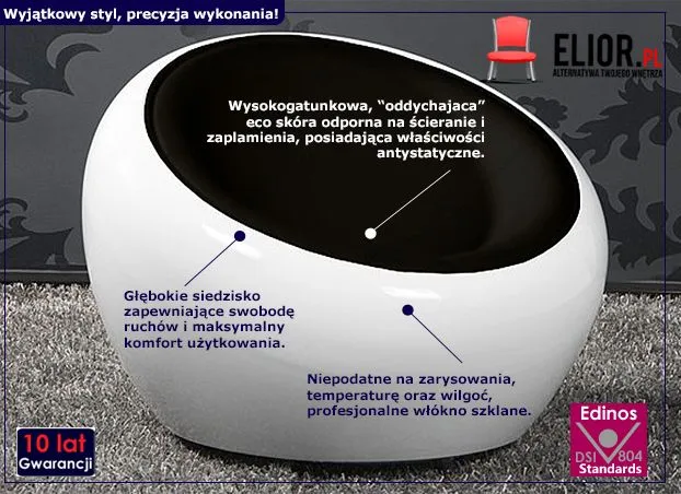 Designerski Kalia został zaprojektowany z wysokiej klasy, starannie dobranych materiałów. Dzięki temu użytkuje się go wprost bajecznie. Siedzisko oraz zagłówek fotela zostały wykonane z nowoczesnej, wysokiej jakości skóry ekologicznej odpornej na zaplamienia i ścieranie, posiadającej szlachetne ultramikrowłókna. Ponadto jest to „oddychający” materiał o antystatycznych właściwościach, zapewniający niezrównaną miękkość i gładkość obicia. Obudowa fotela to profesjonalne, niepodatne na zarysowania, wilgoć oraz korozję włókno szklane o klasie higieny E1. Prezentuje się ono nad wyraz awangardowo i ciekawie. Innowacyjna biel fotela połączona z ponadczasową czernią to po prostu aranżacyjny strzał w dziesiątkę. Szlachetne materiały, z których został stworzony fotel Kalia gwarantują niezrównany komfort, ale i niebanalny, awangardowy design wnętrza, który zachwyca już od progu. Ponadto Kalia to staranny w każdym calu model fotela wypoczynkowego. Jego świetna jakość wykonania to gwarancja wieloletniego użytkowania mebla bez uszkodzeń. Znakomitym fotelem Kalia możesz cieszyć się niezmiennie przez lata. Nowatorski design fotela wniesie do Twojego wnętrza powiew aranżacyjnej świeżości. Kalia jest znakomitą propozycją nie tylko do domowego salonu, lecz także do nowoczesnej kawiarni, designerskiej restauracji czy stylowego biura.