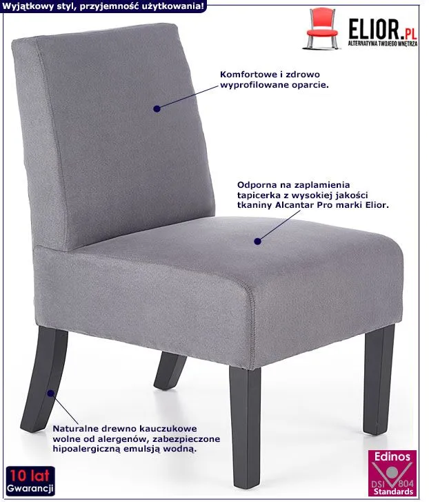 Fotel jest jednym z najstarszych i najważniejszych mebli towarzyszących człowiekowi. Nie od dziś wiadomo, że stan poruszenia naszego umysłu w różnych etapach życiowych, przyjmuje wartości pozytywne jak i negatywne. Korzystając z codziennych, darmowych i magicznych usług Twojego fotela możesz sprawić, aby uczucia interpretujące emocje, które do Ciebie docierają, obierane były w sposób miły, pozytywny, a nawet twórczy. To właśnie ten mebel powinien zagwarantować Ci wygodną chwilę relaksu i odprężenia, pomagając odkryć dodatkowe pokłady energii, które w sobie ukrywasz. Zadbaj więc o to, aby to właśnie Twój fotel, reprezentował najwyższą formę i klasę jakości oraz stylu. Postaw na markę Elior, która jako jedyna na rynku zapewnia Ci aż 10 lat gwarancji oraz niedościgniony, jakże wyjątkowy i nagradzany na całym świecie design.