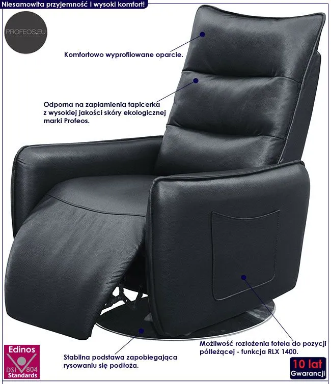 Fotel jest jednym z najstarszych i najważniejszych mebli towarzyszących człowiekowi. Nie od dziś wiadomo, że stan poruszenia naszego umysłu w różnych etapach życiowych, przyjmuje wartości pozytywne jak i negatywne. Korzystając z codziennych, darmowych i magicznych usług Twojego fotela możesz sprawić, aby uczucia interpretujące emocje które do nas docierają, obierane były w sposób miły, pozytywny a nawet twórczy. To właśnie ten mebel powinien zagwarantować Ci wygodną chwilę relaksu i odprężenia, pomagając odkryć dodatkowe pokłady energii, które w sobie ukrywasz. Zadbaj więc o to, aby to właśnie Twój fotel reprezentował najwyższą formę i klasę jakości oraz stylu. Postaw na markę Profeos, która jako jedyna na rynku zapewnia Ci aż 10 lat gwarancji oraz niedościgniony, jakże wyjątkowy i nagradzany na całym świecie design.