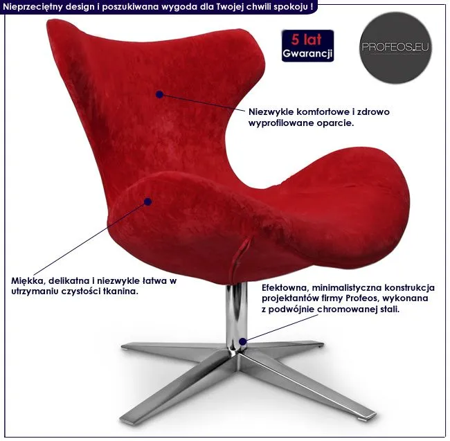 Fotel jest jednym z najstarszych i najważniejszych mebli towarzyszących człowiekowi. Nie od dziś wiadomo, że stan poruszenia naszego umysłu w różnych etapach życiowych, przyjmuje wartości pozytywne jak i negatywne. Korzystając z codziennych, darmowych i magicznych usług Twojego fotela możesz sprawić, aby uczucia interpretujące emocje które do nas docierają, obierane były w sposób miły, pozytywny a nawet twórczy. To właśnie ten mebel powinien zagwarantować Ci wygodną chwilę relaksu i odprężenia, pomagając odkryć dodatkowe pokłady energii, które w sobie ukrywasz. Zadbaj więc o to, aby to właśnie Twój fotel reprezentował najwyższą formę i klasę jakości oraz stylu. Postaw na markę Profeos, która jako jedyna na rynku zapewnia Ci aż 5 lat gwarancji oraz niedościgniony, jakże wyjątkowy i nagradzany na całym świecie design.