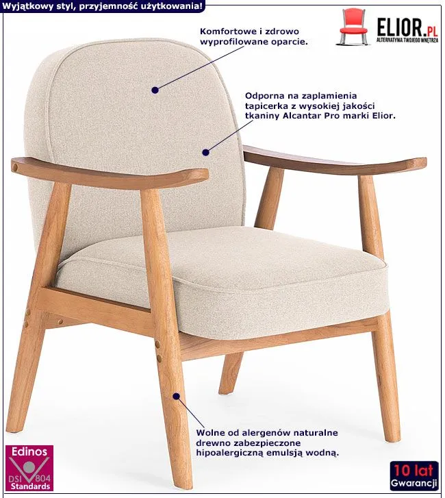 Komfortowy w użytkowaniu fotel w stylu retro Bateria wyróżnia się nie tylko swoją unikalną formą, ale także zastosowaniem materiałów najlepszej jakości. Designerska tapicerka mebla w kolorze beżowym wykonana została z wysokiej jakości tkaniny Alcantar Pro, charakteryzującej się dużą odpornością na ścieranie i zabrudzenie oraz niezwykłą miękkością w dotyku (dzięki warstwie poliuretanu). Tkanina Alcantar Pro, która jako jedyna na rynku produkowana jest z dokładnie wyselekcjonowanych ultramikrowłókien o objętości aż do 24-razy drobniejszej od ludzkiego włosa, charakteryzuje się wyjątkową żywotnością, odpornością oraz niezwykłą łatwością w utrzymaniu. Posiada ponadprzeciętne cechy wytrzymałościowe, dzięki czemu unikniesz co sezonowej wymiany tapicerki. Tkanina Alcantar jest także bardzo praktyczna i można ją czyścić na mokro. Profil mebla stworzony został z naturalnego drewna, wolnego od alergenów, a następnie zabezpieczonego hipoalergiczną emulsją wodną. Lite drewno wyróżnia się niezwykłą wytrzymałością i odpornością na uszkodzenia mechaniczne, co gwarantuje Ci długie i komfortowe użytkowanie. Fotel wypoczynkowy marki Elior doskonale nadaje się zarówno do salonu czy sypialni, jak też do urządzonego w stylu vintage biura czy pracowni. Bateria gwarantuje, że oglądanie filmu, programu telewizyjnego czy lektura przy filiżance kawy stają się jeszcze większą przyjemnością! Daj się uwieść niesamowitemu designowi fotela Elior - nie uwierzysz, jak mogłeś obejść się bez niego do tej pory!