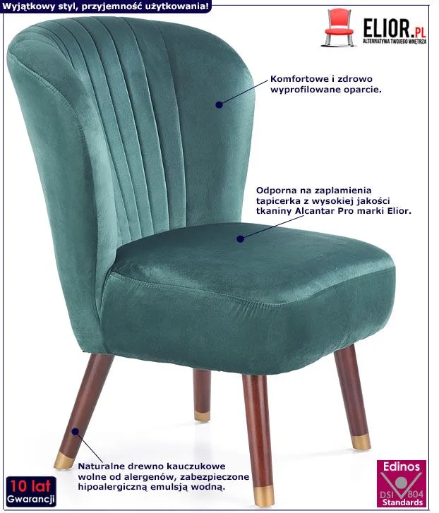 Zjawiskowy i komfortowy w użytkowaniu fotel relaksacyjny Viani wyróżnia się nie tylko swoją unikalną formą, ale także zastosowaniem materiałów najlepszej jakości. Designerska tapicerka mebla w kolorze ciemnozielonym wykonana została z wysokiej jakości tkaniny Alcantar Pro, charakteryzującej się dużą odpornością na ścieranie i zabrudzenie oraz niezwykłą miękkością w dotyku (dzięki warstwie poliuretanu). Tkanina Alcantar Pro, która jako jedyna na rynku produkowana jest z dokładnie wyselekcjonowanych ultramikrowłókien o objętości aż do 24-razy drobniejszej od ludzkiego włosa, charakteryzuje się wyjątkową żywotnością, odpornością oraz niezwykłą łatwością w utrzymaniu. Posiada ponadprzeciętne cechy wytrzymałościowe, dzięki czemu unikniesz co sezonowej wymiany tapicerki. Tkanina Alcantar jest także bardzo praktyczna i można ją czyścić na mokro. Profil mebla w kolorze ciemny orzech stworzony został z naturalnego drewna kauczukowego wolnego od alergenów, a następnie zabezpieczonego hipoalergiczną emulsją wodną. Lite drewno wyróżnia się niezwykłą wytrzymałością i odpornością na uszkodzenia mechaniczne, co gwarantuje Ci długie i komfortowe użytkowanie. Fotel wypoczynkowy marki Elior doskonale nadaje się zarówno do salonu czy sypialni, jak też do urządzonego w stylu retro biura czy pracowni. Viani sprawia, że oglądanie filmu, programu telewizyjnego czy lektura przy filiżance kawy stają się jeszcze większą przyjemnością! Daj się uwieść niesamowitemu designowi fotela Viani - nie uwierzysz, jak mogłeś obejść się bez niego do tej pory!