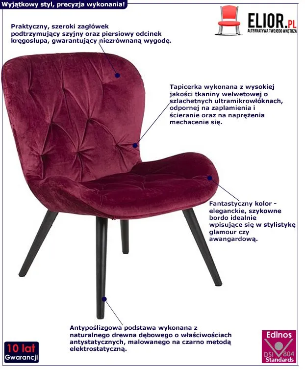 - Modna kolorystyka: bordowy, czarny. Kliknij w link i sprawdź także inne czerwone fotele w sklepie Edinos.pl. Stwórz swój praktyczny zestaw mebli.