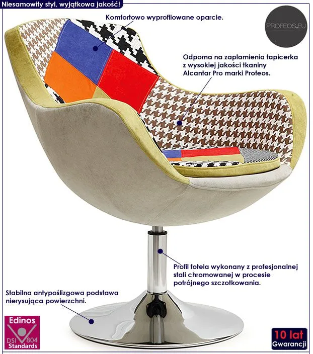 Zjawiskowy i wyjątkowo komfortowy fotel Kelson wyróżnia się nie tylko swoją unikalną formą, ale także zastosowaniem materiałów najlepszej jakości. To dlatego cieszy się on powodzeniem wśród osób wybierających nowatorskie rozwiązania i szybko zyskał status bestsellera. Designerska, wzorzysta tapicerka mebla pokryta została wysokiej jakości profesjonalną tkaniną Alcantar Pro marki Profeos, charakteryzującą się dużą odpornością na ścieranie i zabrudzenie oraz niezwykłą miękkością w dotyku (dzięki warstwie poliuretanu). Tkanina Alcantar Pro marki Profeos, która jako jedyna na rynku produkowana jest z dokładnie wyselekcjonowanych ultramikrowłókien o objętości aż do 24-razy drobniejszej od ludzkiego włosa, charakteryzuje się wyjątkową żywotnością, odpornością oraz niezwykłą łatwością w utrzymaniu. Posiada ponadprzeciętne cechy wytrzymałościowe. Tkanina Alcantar jest także bardzo praktyczna i można ją czyścić na mokro. Profil mebla wykonany został z najwyższej jakości stali chromowanej o zawartości aż stali nierdzewnej oraz chromu, co gwarantuje mu niezwykły efekt wizualny, posiadając przy tym ponadprzeciętne cechy antykorozyjne oraz lepszą odporność na uszkodzenia mechaniczne . Fotel wypoczynkowy Profeos doskonale nadaje się zarówno do salonu czy sypialni, jak też do pokoju dziecięcego czy nowoczesnego biura. Kelson sprawia, że oglądanie filmu, programu telewizyjnego czy lektura przy filiżance kawy stają się jeszcze większą przyjemnością! Daj się uwieść niesamowitemu designowi fotela Kelson, zakochasz się w nim od pierwszego wejrzenia!