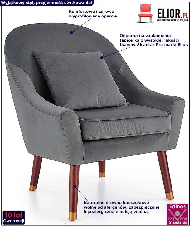 Zjawiskowy i komfortowy w użytkowaniu fotel Relia wyróżnia się nie tylko swoją unikalną formą, ale także zastosowaniem materiałów najlepszej jakości. Designerska tapicerka mebla w kolorze ciemnopopielatym wykonana została z wysokiej jakości tkaniny Alcantar Pro, charakteryzującej się dużą odpornością na ścieranie i zabrudzenie oraz niezwykłą miękkością w dotyku (dzięki warstwie poliuretanu). Tkanina Alcantar Pro, która jako jedyna na rynku produkowana jest z dokładnie wyselekcjonowanych ultramikrowłókien o objętości aż do 24-razy drobniejszej od ludzkiego włosa, charakteryzuje się wyjątkową żywotnością, odpornością oraz niezwykłą łatwością w utrzymaniu. Posiada ponadprzeciętne cechy wytrzymałościowe, dzięki czemu unikniesz co sezonowej wymiany tapicerki. Tkanina Alcantar jest także bardzo praktyczna i można ją czyścić na mokro. Profil mebla stworzony został z naturalnego drewna kauczukowego w kolorze ciemny orzech, wolnego od alergenów, a następnie zabezpieczonego hipoalergiczną emulsją wodną. Lite drewno wyróżnia się niezwykłą wytrzymałością i odpornością na uszkodzenia mechaniczne, co gwarantuje Ci długie i komfortowe użytkowanie. Fotel wypoczynkowy marki Elior doskonale nadaje się zarówno do salonu czy sypialni, jak też do nowoczesnego biura czy pracowni. Relia sprawia, że oglądanie filmu, programu telewizyjnego czy lektura przy filiżance kawy stają się jeszcze większą przyjemnością! Daj się uwieść niesamowitemu designowi fotela Relia - nie uwierzysz, jak mogłeś obejść się bez niego do tej pory!