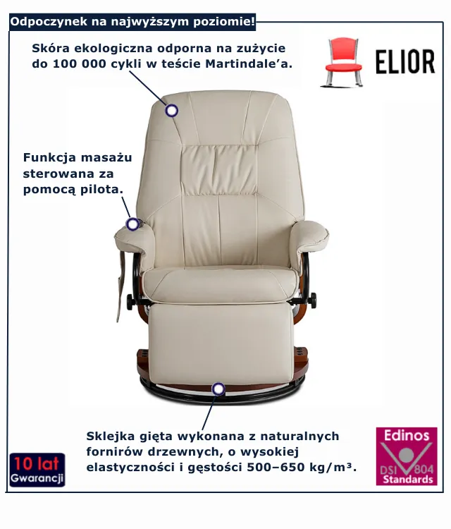 • Profesjonalna tapicerka ze skóry ekologicznej o wysokich parametrach technicznych - odporność na zużycie do 100 000 cykli w teście Martindale’a.