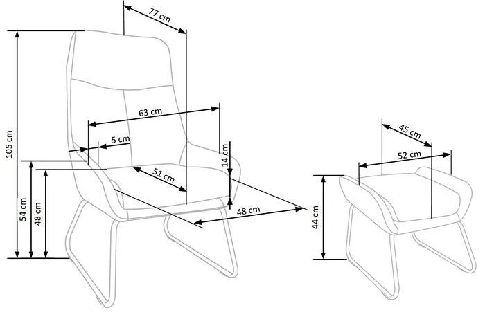 - Fotel: szerokość mebla: 63 cm, szerokość siedziska: 48 cm, głębokość mebla: 77 cm, głębokość siedziska: 51 cm, wysokość siedziska: 48 cm, wysokość mebla: 105 cm.