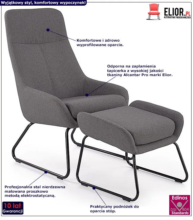 Zjawiskowy i komfortowy w użytkowaniu fotel relaksacyjny Santo wyróżnia się nie tylko swoim modnym designem, ale także zastosowaniem materiałów najlepszej jakości. Designerska tapicerka mebla w kolorze ciemnopopielatym wykonana została z wysokiej jakości tkaniny Alcantar Pro, charakteryzującej się dużą odpornością na ścieranie i zabrudzenie oraz niezwykłą miękkością w dotyku (dzięki warstwie poliuretanu). Tkanina Alcantar Pro, która jako jedyna na rynku produkowana jest z dokładnie wyselekcjonowanych ultramikrowłókien o objętości aż do 24-razy drobniejszej od ludzkiego włosa, charakteryzuje się wyjątkową żywotnością, odpornością oraz niezwykłą łatwością w utrzymaniu. Posiada ponadprzeciętne cechy wytrzymałościowe, dzięki czemu unikniesz co sezonowej wymiany tapicerki. Tkanina Alcantar jest także bardzo praktyczna i można ją czyścić na mokro. Konstrukcję mebla wyprodukowano stworzono z najwyższej jakości nierdzewnej stali malowanej odpornym na zarysowania i zadrapania. Najwyższa jakość techniki polimeryzacji pozwoliła zaoferować firmie Elior aż 10 lat gwar. na swoje produkty. Już nie musisz się martwić, że po kilku latach część farby odpryśnie od mebla . Zastosowanie tych odpornych na uszkodzenia materiałów znacząco wydłuża czas eksploatacji mebla, co pozwoli Ci na cieszenie się jego wygodą przez długie lata.