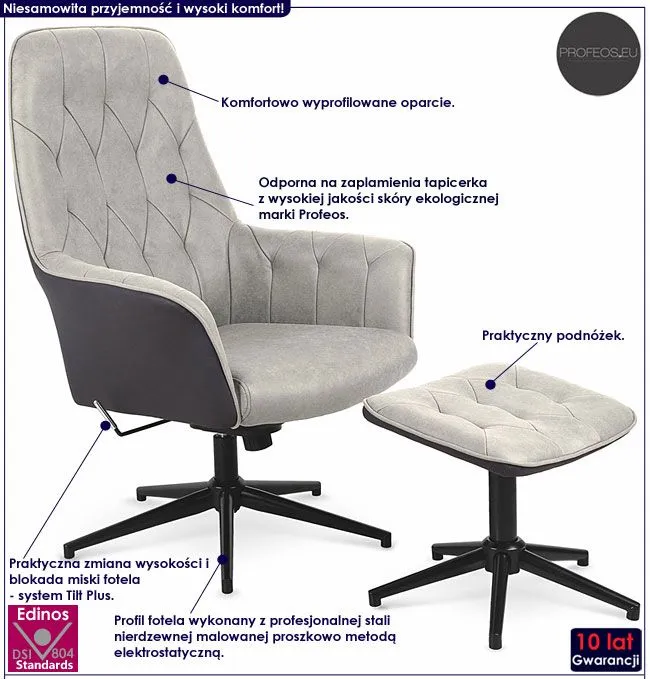Fotel jest jednym z najstarszych i najważniejszych mebli towarzyszących człowiekowi. Nie od dziś wiadomo, że stan poruszenia naszego umysłu w różnych etapach życiowych, przyjmuje wartości pozytywne jak i negatywne. Korzystając z codziennych, darmowych i magicznych usług Twojego fotela możesz sprawić, aby uczucia interpretujące emocje które do nas docierają, obierane były w sposób miły, pozytywny a nawet twórczy. To właśnie ten mebel powinien zagwarantować Ci wygodną chwilę relaksu i odprężenia, pomagając odkryć dodatkowe pokłady energii, które w sobie ukrywasz. Zadbaj więc o to, aby to właśnie Twój fotel reprezentował najwyższą formę i klasę jakości oraz stylu. Postaw na markę Profeos, która jako jedyna na rynku zapewnia Ci aż 10 lat gwarancji oraz niedościgniony, jakże wyjątkowy i nagradzany na całym świecie design.