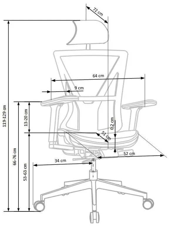 - Wymiary: szerokość mebla: 64 cm, szerokość siedziska: 52 cm, głębokość mebla: 72 cm, głębokość siedziska: 51 cm, wysokość siedziska: 43-52 cm, wysokość od podłoża do końca podłokietników: 56-72 cm, wysokość całkowita: 110-135 cm. Wymiar zagłówka: 30x16 cm.