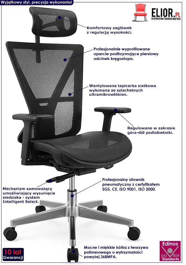 Fotel marki Elior wyposażony jest w profesjonalny mechanizm Intelligent Select. Samoważący system Intelligent Select sam dopasowuje siłę potrzebną do odchylenia oparcia, umożliwia także zmianę głębokości wysuwu siedziska, co sprawia, że będziesz mógł dostosować siedzisko do swoich potrzeb. Ergonomicznie wyprofilowane we współpracy z europejskimi ortopedami siedzisko oraz oparcie zapewniają Ci komfort pracy nawet przez dłuższy czas. Wygodny zagłówek oraz komfortowe podłokietniki dodatkowo przynoszą ulgę zmęczonym rękom i zapobiegają sztywnieniu mięśni szyi i karku. Regulowana wysokość oparcia, zagłówka oraz podłokietników gwarantuje, że perfekcyjnie dopasujesz fotel do swoich własnych potrzeb. Nie musisz ryzykować nabycia wad postawy spowodowanych użytkowaniem tanich, nieprawidłowo wymodelowanych krzeseł. Zainwestuj w zdrowie Twoje i Twoich najbliższych kupując wysokiej jakości fotel marki Elior.