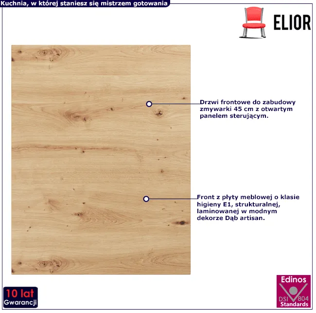 Projektowanie mebli kuchennych to sztuka. Podobnie jak w sztuce gotowania, tu liczy się precyzja, proporcje, jakość składników oraz szczypta wyobraźni. Tak właśnie został zaprojektowany front do zabudowy zmywarki 45 cm Orion 18X. Front zrobiliśmy z 16 mm laminowanej płyty meblowej o klasie higieny E1. Płyta została wykonana w specjalnej technice odwzorowującej naturalną teksturę i usłojenie drewna w modnej kolorystyce Dąb artisan. Model Kelson 18X został dostosowany do wymiarów standardowych zmywarek 45 cm z otwartym panelem sterującym, zapewniając łatwy dostęp do przycisków. Tak zaprojektowana obudowa zmywarki Kelson 18X doskonale ukryje sprzęt AGD i stworzy elegancką całość z innymi meblami z kuchennej kolekcji Orion. Sprawdź czym jeszcze wyróżnia się Kelson 18X marki Elior!