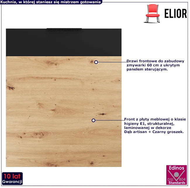 Projektowanie mebli kuchennych to sztuka. Podobnie jak w sztuce gotowania, tu liczy się precyzja, proporcje, jakość składników oraz szczypta wyobraźni. Tak właśnie został zaprojektowany front do zabudowy zmywarki 60 cm Orion 21X. Front zrobiliśmy z 16 mm laminowanej płyty meblowej o klasie higieny E1. Płyta została wykonana w specjalnej technice odwzorowującej naturalną teksturę i usłojenie drewna w modnej kolorystyce Dąb artisan + czarny groszek. Model Kelson 21X został dostosowany do wymiarów standardowych zmywarek 60 cm z ukrytym panelem sterującym. Tak zaprojektowana obudowa zmywarki Kelson 21X doskonale ukryje sprzęt AGD i stworzy elegancką całość z innymi meblami z kuchennej kolekcji Orion. Sprawdź czym jeszcze wyróżnia się Kelson 21X marki Edinos Premium!