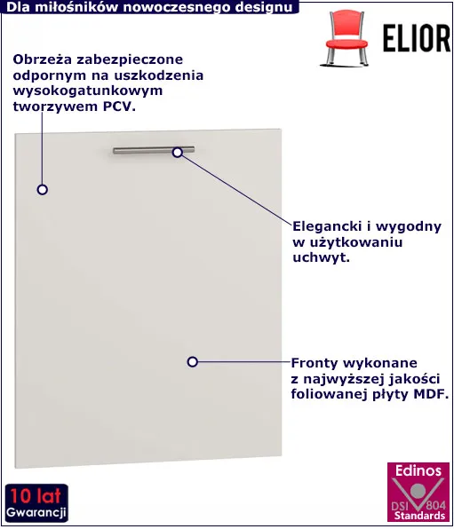 Od dłuższego czasu w kuchennej modzie panuje minimalizm. Istotna jest zamknięta i prosta forma. Odpowiadając na rosnącą popularność trendów i potrzeb konsumentów, producenci firmy Edinos Premium zaprojektowali wysokiej jakości system mebli kuchennych Limo. Ukryte w zabudowie meblarskiej sprzęty AGD to inwestycja w spójną wizualnie, estetyczną i funkcjonalną kuchnię. Marka Edinos Premium do ofert mebli Limo dodała kolejny element, tym razem jest to front zmywarki Vokres 34X. Front dostępny jest w trzech wersjach kolorystycznych: biały, jasny beż, jasny popiel i dąb miodowy. Ponadto front wyprodukowaliśmy z wysokogatunkowej płyty MDF laminowanej o podwyższonej trwałości i gęstości. Tego rodzaju front to niczym najpiękniejsze przebranie dla Twojej szafki, to dzięki niemu Twoja kuchnia nabierze blasku, charakteru i wyróżni się spośród setek innych mebli. Wzbogacenie szafki w chromowany uchwyt to inwestycja w stylowy mebel, który świetnie dopasuje się do pozostałych mebli z kolekcji. Nowoczesny chromowany uchwyt ułatwi użytkowanie zmywarki. Jednolita zabudowa to również inwestycja w łatwą w utrzymaniu czystości kuchnię. Tak zaprojektowana kuchnia to tak naprawdę utrzymywanie w czystości zaledwie jednej powierzchni. Dzięki idealnie dopasowanym elementom kuchnia pozbawiona jest szpar i trudno dostępnych zakamarków, co również wpływa na skrócony czas sprzątania. Nowoczesne meble Limo pozwolą Ci wypełnić wszystkie wnęki i umożliwią osiągnąć pożądany efekt uporządkowanej kuchni.