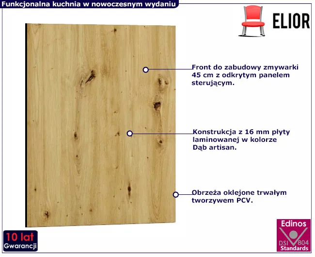 Kolekcja mebli kuchennych Beril marki Edinos Premium to zaproszenie do świata gdzie prostota i funkcjonalność tworzą przestrzeń do kreatywnej przygody w świecie smaków i aromatów. Zjawiskowy design frontów w 2 wydaniach: ciepłej barwie dębu artisan lub eleganckim graficie nadaje wnętrzu ponadczasowej elegancji. Atutem kolekcji jest wysoka jakość w atrakcyjnej cenie, profesjonalne wykonanie oraz możliwość stworzenia własnego zestawu kuchennego dostosowanego do potrzebBogaty wybór modeli to doskonały przepis na aranżację każdej kuchni, od tych przestronnych, przez niewielkie, aż po mini aneksy kuchenne. Kolekcja Beril składa się z praktycznych szafek dolnych i górnych, mebli do zabudowy sprzętu AGD, szafek na zlew oraz szafek z koszami cargo.  Oto kolejna propozycja z kolekcji Beril – front do zmywarki 45 cm Coleo 15X!