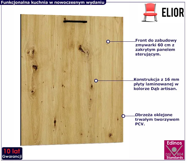 Kolekcja mebli kuchennych Beril marki Elior to zaproszenie do świata gdzie prostota i funkcjonalność tworzą przestrzeń do kreatywnej przygody w świecie smaków i aromatów. Zjawiskowy design frontów w 2 wydaniach: ciepłej barwie dębu artisan lub eleganckim graficie nadaje wnętrzu ponadczasowej elegancji. Atutem kolekcji jest wysoka jakość w atrakcyjnej cenie, profesjonalne wykonanie oraz możliwość stworzenia własnego zestawu kuchennego dostosowanego do potrzebBogaty wybór modeli to doskonały przepis na aranżację każdej kuchni, od tych przestronnych, przez niewielkie, aż po mini aneksy kuchenne. Kolekcja Beril składa się z praktycznych szafek dolnych i górnych, mebli do zabudowy sprzętu AGD, szafek na zlew oraz szafek z koszami cargo.  Oto kolejna propozycja z kolekcji Beril – front do zmywarki 60 cm Coleo 18X!