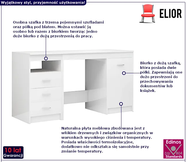 • Kolor: biały z wysokim połyskiem. W naszej ofercie posiadamy także inne biurka.