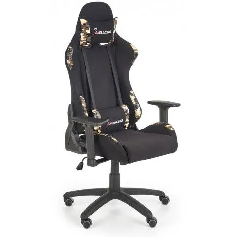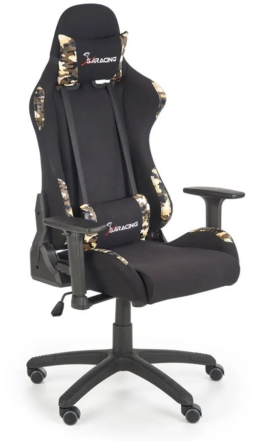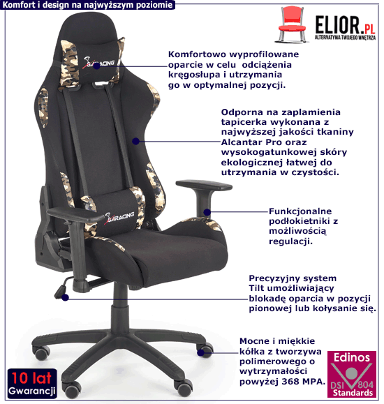 Fotel Agdo zdecydowanie wyróżnia się swoim oryginalnym i nowoczesnym designem, który został zaprojektowany przez młodych wizjonerów, lubujących się w funkcjonalnych i futurystycznych meblach. Sam jego  wygląd pozwoli Ci się przenieść w inny, intrygujący świat. Elegancka czerń z wojskowym kolorem moro nadają mu niebanalnych cech wizualnych. Miękka tapicerka okalająca fotel wykonana jest z wysokogatunkowej tkaniny Alcantar Pro. Jest niesamowicie odporna na ścieranie i zabrudzenia, oraz niezwykle miękka w dotyku dzięki warstwie poliuretanu. Jako jedyna produkowana jest z wyselekcjonowanych ultramikrowłókien o objętości aż do 24-razy drobniejszej od ludzkiego włosa. Dzięki temu jest niezwykle łatwa w utrzymaniu czystości. Dodatki powstały z wysokogatunkowej skóry ekologicznej, która jest o wiele bardziej odporna na słońce i substancje płynne od innych, konkurencyjnych produktów. Dodatkowo bardzo łatwo utrzymać ja w czystości, co jest nieocenioną zaletą, gdyż często towarzyszy nam napój lub kawa. Zapewniające lekkie i sprawne przesuwanie fotela kółka, wykonane zostały z najwyższej jakości, profesjonalnego tworzywa polimerowego o klasie wytrzymałości powyżej 368 MPA. Dzięki tak wysokogatunkowym surowcom mebel charakteryzuje się najwyższą jakością i precyzją wykonania. Zatem zainwestuj w to co najlepsze i rozpocznij swoją przygodę z fantastycznym fotelem Agdo.