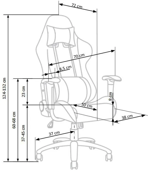 • Wymiary: wysokość całkowita: 124-132 cm, wysokość siedziska: 37-45 cm, głębokość mebla: 72 cm, głębokość siedziska: 50 cm,  szerokość mebla: 70 cm, szerokość siedziska: 38 cm.