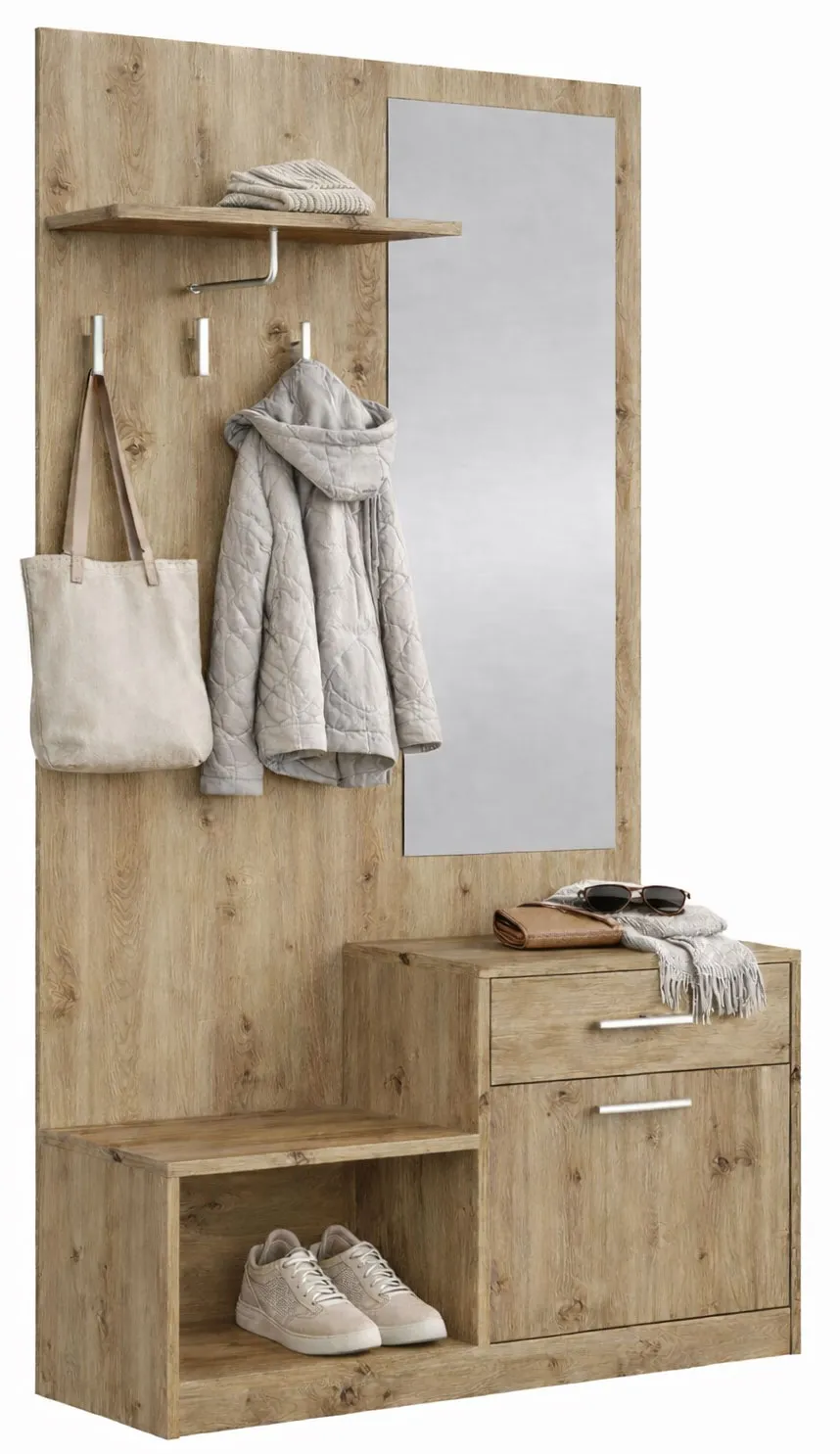 • Górna półka na dodatki – idealne miejsce na kapelusz, czapkę, szalik lub inne drobiazgi, które warto mieć przy drzwiach.