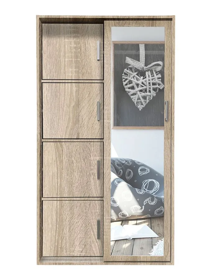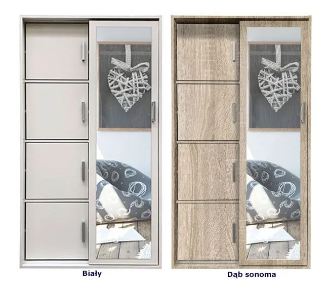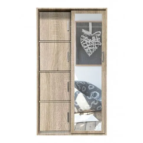 Szykowny dąb sonoma, w połączeniu z eleganckim, skandynawskim designem, powiększającą optycznie wnętrze pokoju, bądź korytarza taflą lustra, przesuwanymi drzwiami, wyposażonymi w minimalistyczne uchwyty, zgrabnymi półkami, oraz dodatkową powierzchnią, przedzieloną na dwie równe czesci I zaopatrzoną w funkcjonalne aluminiowe wieszaki tworzy spójną, efektowną całość.