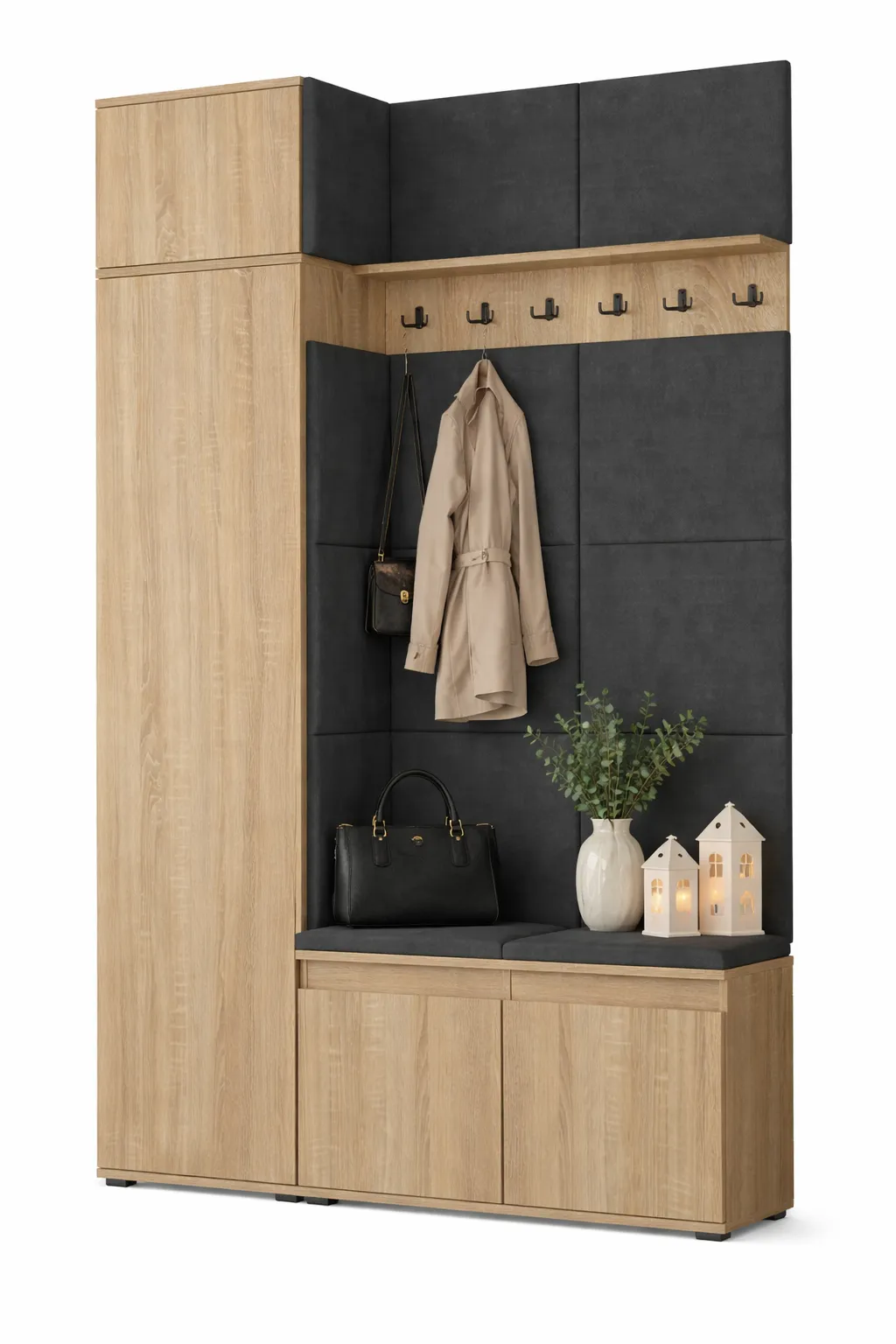 • Funkcjonalność: Szafa z nadstawką, wieszak na ubrania, półka i szafka na buty zapewniają optymalną organizację przestrzeni.