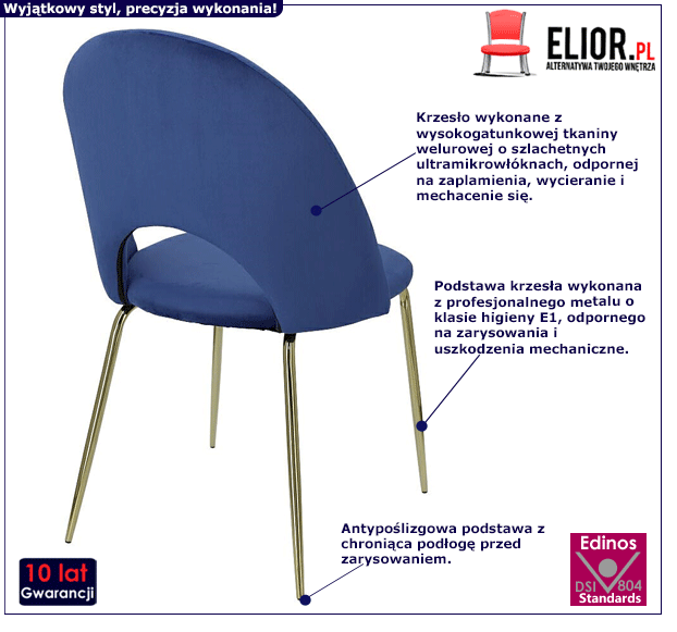 Elegancko i interesująco zaprojektowane krzesło Moggi jest meblem cechującym się awangardową, ale i uniwersalną formą. Jest to zasługa między innymi starannie dobranych i niezwykle trwałych materiałów meblarskich. Dzięki nim krzesło Moggi użytkuje się naprawdę wygodnie, przyjemnie i co istotne – bez uszkodzeń przez wiele lat. Do produkcji krzesła wykorzystano poddane specjalistycznej obróbce, nowoczesne surowce. Są to: profesjonalny metal o klasie higieny E1, odporne na rysy i uszkodzenia mechaniczne chromowany proszkowo metodą elektrostatyczną, miękka tkanina welurowa o szlachetnych ultramikrowłóknach, odporna na zaplamienia i wycieranie się oraz wysokogatunkowa, naturalna sklejka posiadająca dużą wytrzymałość na zaginanie i rozciąganie. Jakże to istotne, by meble, w które inwestujemy, cechowało wytrzymałe, staranne wykonanie. Na szczęście z fantastycznym krzesłem welurowym Moggi nie trzeba się o to martwić! Ten pełen wyrafinowanego, a przy tym interesującego charakteru mebel wciąż cieszy oko niebywałym wdziękiem. Moggi posiada bezsprzecznie wiele zalet – trwałość, stabilność, dokładne wykonanie, funkcjonalizm i oczywiście świeżą, pełną klasy i pomysłowości prezencję. Chyba każdy przyzna, że warto mieć tak ekstrawagancki i funkcjonalny mebel w swoich starannie i przemyślanie zaaranżowanych i wypielęgnowanych stylowo przestrzeniach. Z wygodnie i trwale zaprojektowanym krzesłem welurowym Moggi na pewno urządzisz się komfortowo i stylowo. Ten piękny mebel ozdobi Twoje wnętrze i nada mu zniewalającego, jedynego w swoim rodzaju charakteru!