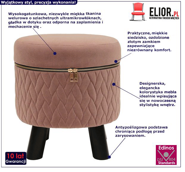 Czy wykonany w stylu glamour taboret Lami tylko pięknie prezentujący się mebel, na którym można wygodnie przysiąść? Oczywiście, że nie! Kapitalnie prezentujący się taboret Lami to także sprytne aranżacyjne rozwiązanie, dzięki któremu stworzysz w swoim wnętrzu wyjątkową, jakże stylową i jedyną w swoim rodzaju atmosferę. Gustowny Lami może posłużyć Ci na wiele sposobów: jako praktyczna szafeczka, komfortowy podnóżek, siedzisko w przedpokoju, przenośny taboret czy wygodny w użytkowaniu stołek. Piękny, glamour Lami wygląda naprawdę elegancko i szykownie. To wszystko zasługa wyjątkowego weluru oraz wyrafinowanej, ciemnej podstawy oraz elementu złota w postaci suwaka. Miękki i miły w dotyku materiał siedziska sprawia, że Lami wygląda olśniewająco i po prostu chce się go mieć u siebie! Taboret możesz wstawić do wnętrz zaaranżowanych w różnych stylach, na przykład do pomieszczeń: glamour, kontynentalnych, retro, eklektycznych, klasycznych, romantycznych czy boho. Nowoczesny sznyt taboretu Lami idealnie dopasowuje się do przestrzeni zaaranżowanych w modnym, designerskim duchu. Nie tylko domowe, ale i komercyjne przestrzenie polubią się z pomysłowo zaprojektowanym, świetnym taboretem Lami. Jeśli lubisz więc praktyczne meble, które tworzą we wnętrzach niepowtarzalny klimat, to postaw na wyjątkowy, przepięknie zaprojektowany taboret Lami. Ten znakomity mebel na pewno skradnie Twoje serce swoim świetnym, gustownym stylem, ponieważ na żywo prezentuje się jeszcze korzystnie i pięknej!