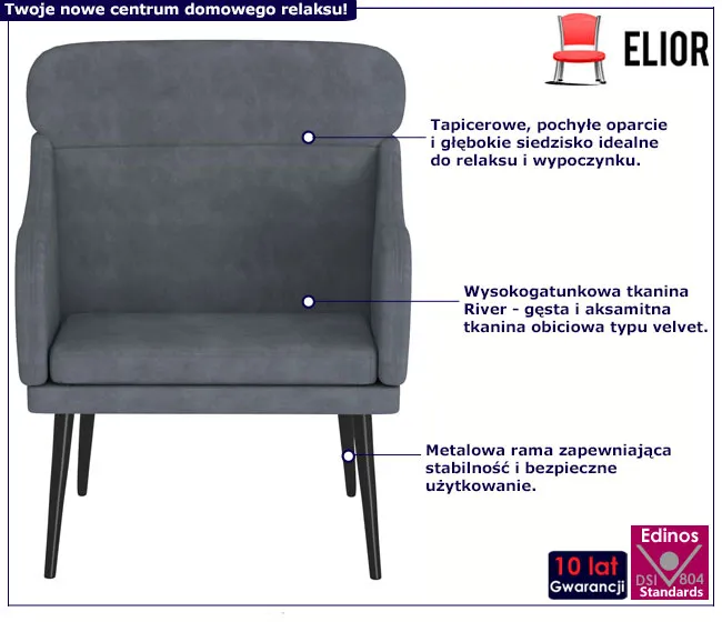 • Kolor: ciemnoszary. W naszej ofercie posiadamy także inne fotele welwetowe.