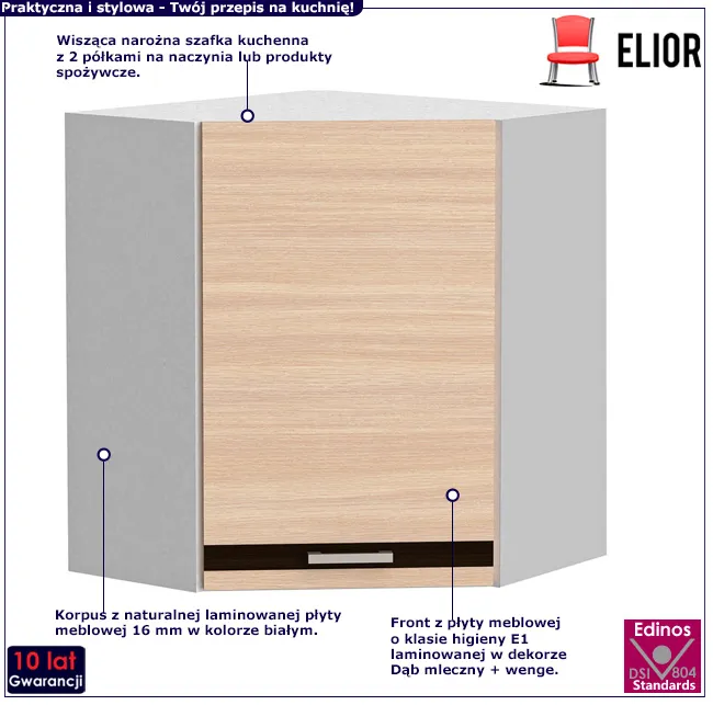 W sztuce designu podobnie jak w sztuce kulinarnej liczy się wysoka jakość składników, dobry smak i odrobina twórczej fantazji. I właśnie tak została zaprojektowana szafka kuchenna Abder 10X marki Elior. Korpus oraz fronty zrobiliśmy z najwyższej jakości 16 mm laminowanej płyty meblowej o klasie higieny E1. Płyta wyróżnia się unikalną teksturą idealnie odwzorowującą strukturę naturalnego drewna. Korpus w kolorze klasycznej bieli harmonijnie koresponduje z kolorystyką frontów w wybarwieniu Dąb mleczny + wenge. Kolorystyczne detale w postaci srebrzystoszarych uchwytów podkreślają nowoczesny design mebla. Za pełnymi drzwiami frontowymi kryją się 2 głębokie półki na naczynia, garnki i kuchenne utensylia. Tak wykonana szafka rogowa Abder 10X jest trwała, odporna na wilgoć i parę, łatwa w utrzymaniu w czystości i niezbędna w każdej kuchni. Sprawdź czym jeszcze wyróżnia się szafka Abder 10X marki Elior!