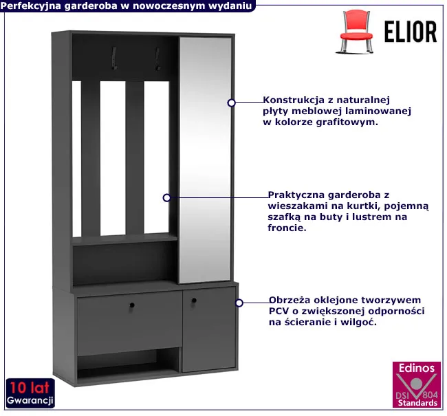 • Modny kolor: Grafitowy. Szukasz stylowej i praktycznej garderoby? Kliknij w link i sprawdź także inne nowoczesne garderoby do przedpokoju w sklepie Edinos.pl. Stwórz własny praktyczny zestaw. Zamawiając produkty razem, oszczędzasz na współnej wysyłce.