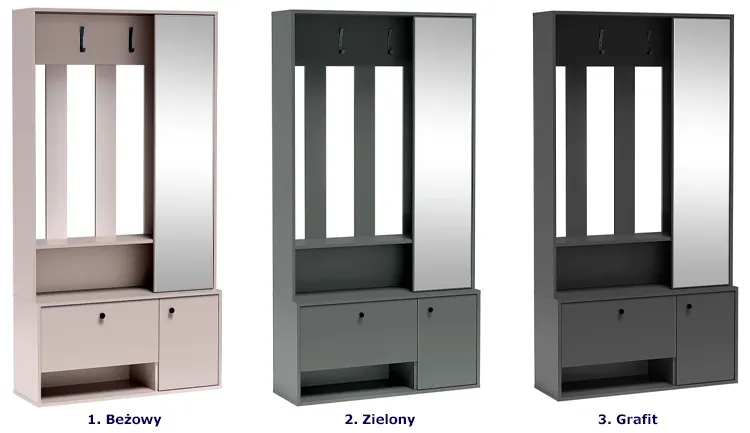 • Wielofunkcyjność: Pojemna szafka na buty, półka na akcesoria, wieszak na odzież i lustro w jednym.